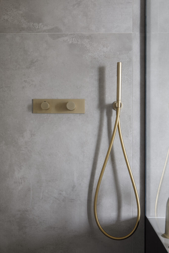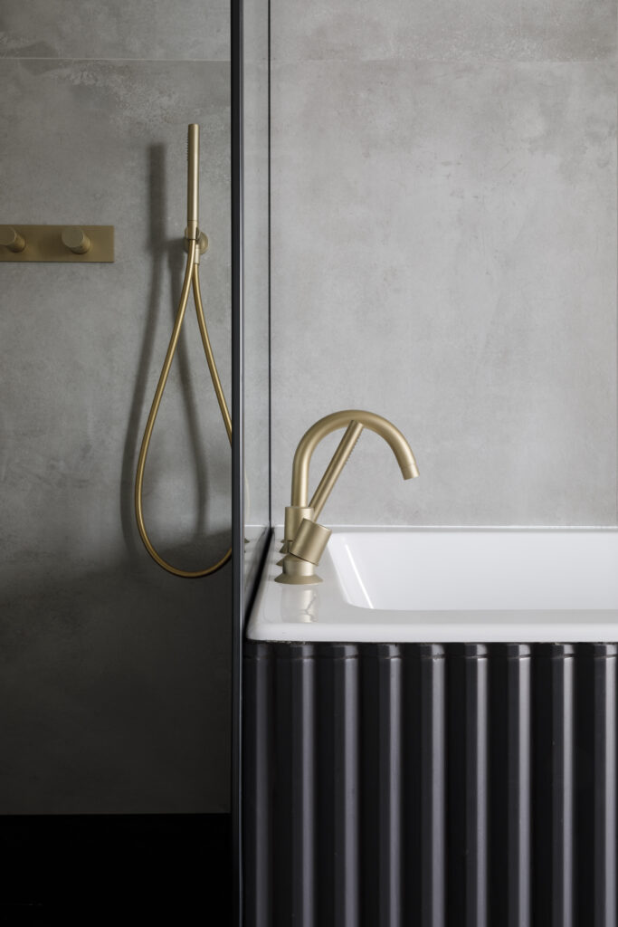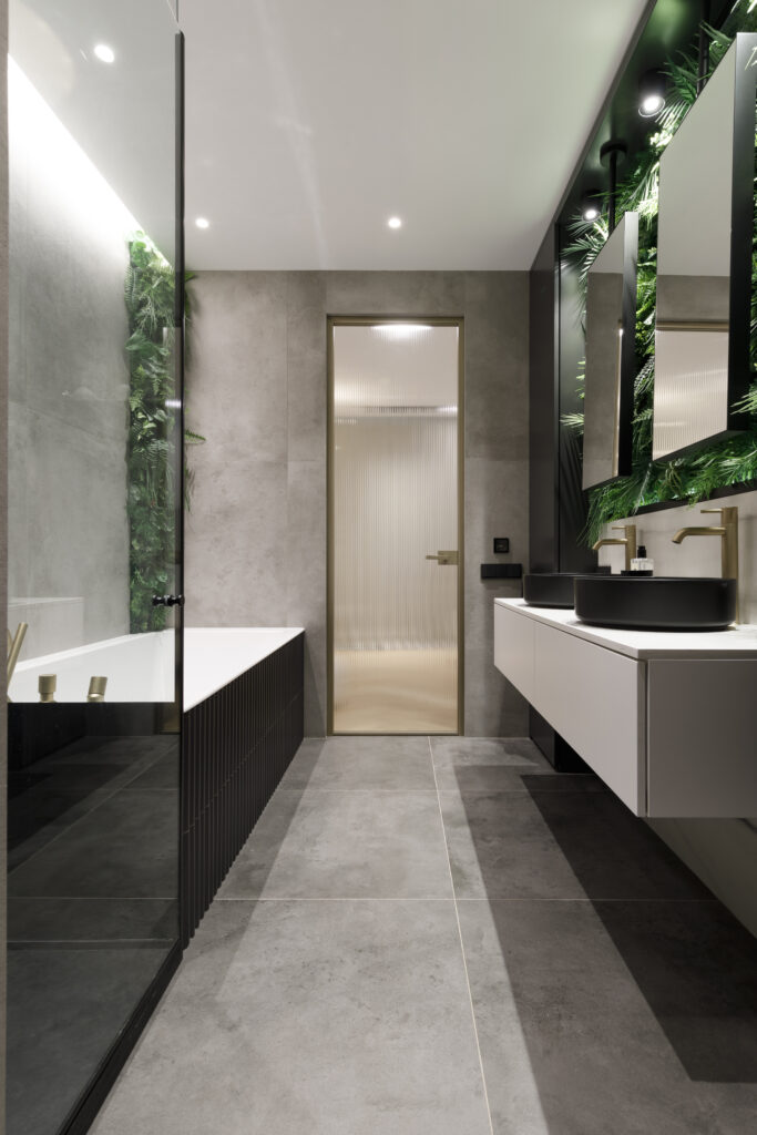 Геометрическая строгость мебели и зеркал усиливает индустриальный характер интерьера, создавая четкий ритм горизонтальных и вертикальных линий. Такой подход подчеркивает архитектурность пространства и создает ощущение порядка и функциональности. Ровные поверхности керамогранита служат идеальным фоном для этой геометрии, не конкурируя с мебелью за внимание, но при этом добавляя пространству глубину и характер.