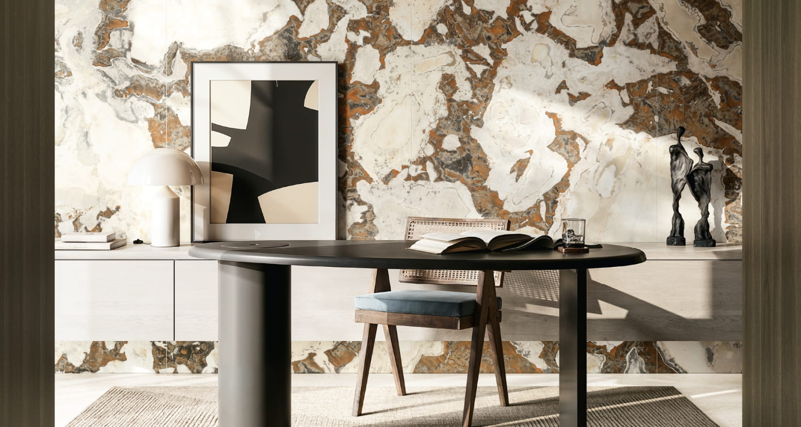 Вторая отличительная черта коллекции — присутствие на отдельных плитах легких рыжеватых полос или пятен, визуально напоминающих окалину или следы минеральных включений. Этот эффект реализован намеренно для максимально достоверной передачи характера натурального камня, в котором подобные оксидные проявления встречаются регулярно и придают материалу индивидуальность.