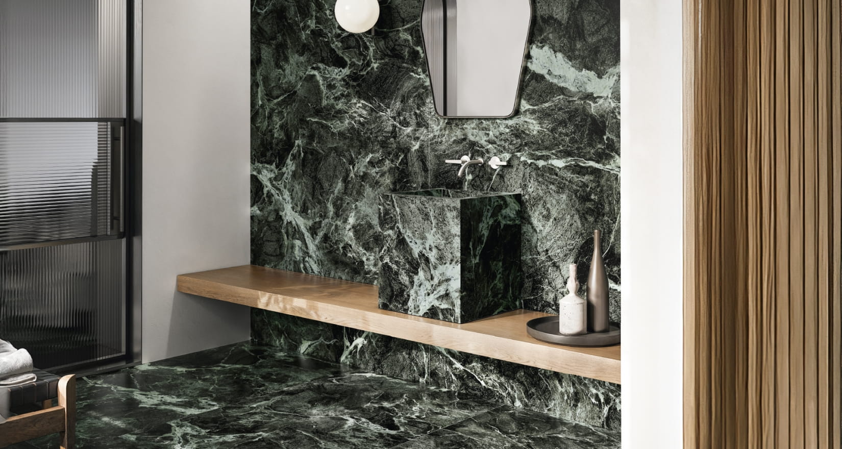 Третий важный нюанс раскрывается при тактильном контакте с материалом или рассмотрении его под определенным углом освещения. Даже натуральная матовая поверхность керамогранита обладает выраженной рельефной структурой, которая особенно заметна в горизонтальной плоскости. Эта текстурность роднит материал с исходным кварцитом и одновременно добавляет благородства, создавая игру света и тени на поверхности покрытия.