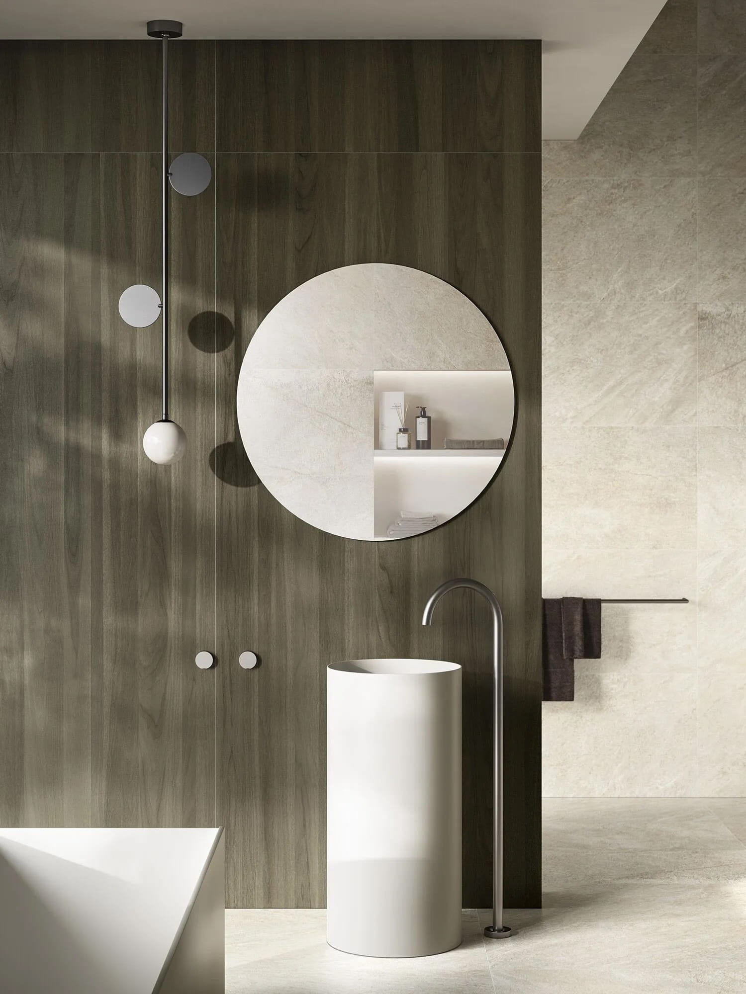Серия Magma выходит за рамки кварцитовой эстетики, предлагая дополнительные фактуры для создания сложных многослойных интерьеров. Впервые в ассортименте Italon появился керамогранит с имитацией дерева в макси-формате 120×278 см — плиты толщиной 6 мм в оттенках Оак и Пеппер. Это решение открывает новые возможности для работы с вертикальными поверхностями значительной высоты, где древесная текстура создает ощущение тепла и натуральности без ограничений, свойственных натуральному дереву.