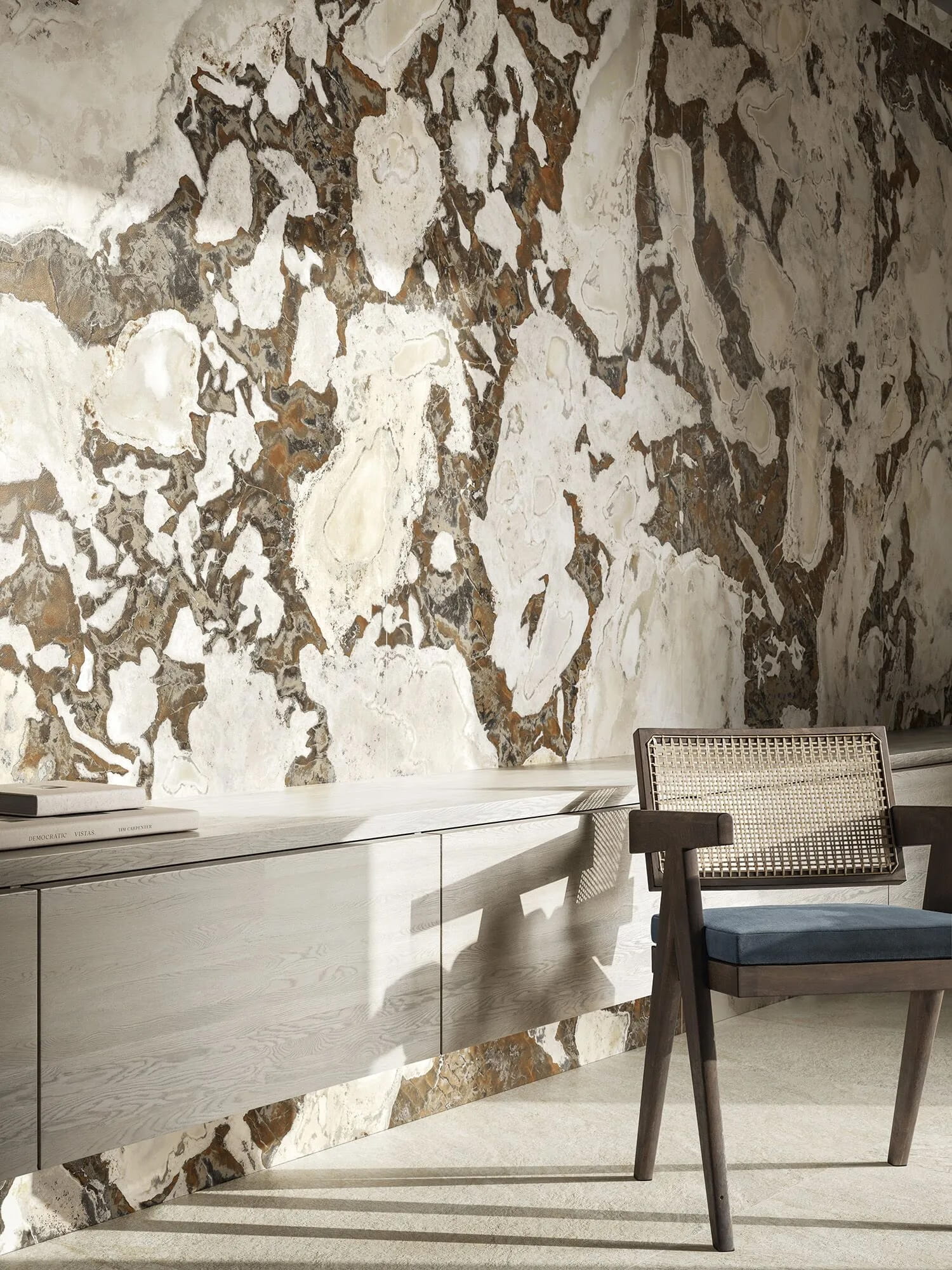 Мраморная составляющая коллекции представлена двумя выразительными вариантами, каждый из которых обладает собственным характером. Довер Тайгер демонстрирует динамичную игру оттенков от нежного бежево-молочного до насыщенного медно-рыжего, создавая эффект теплого солнечного камня с богатой цветовой палитрой. Альпи Грин построен на базе зеленых тонов — решение смелое и актуальное, учитывая растущий интерес к природным оттенкам в интерьерном дизайне. Графика этого варианта отличается турбулентностью и харизмой, где прожилки формируют сложные композиции, напоминающие редкие сорта мрамора с минеральными включениями.