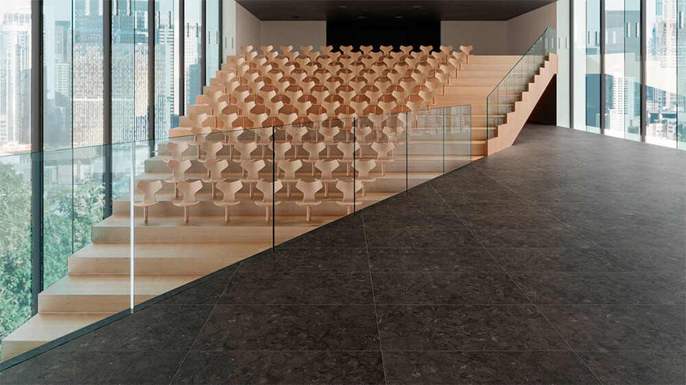 Класс противоскольжения R10 по DIN 51130 делает натуральную поверхность универсальной для большинства интерьерных применений. Безопасна для сухих и умеренно влажных зон. Подходит для жилых помещений, офисов, торговых залов, коридоров.